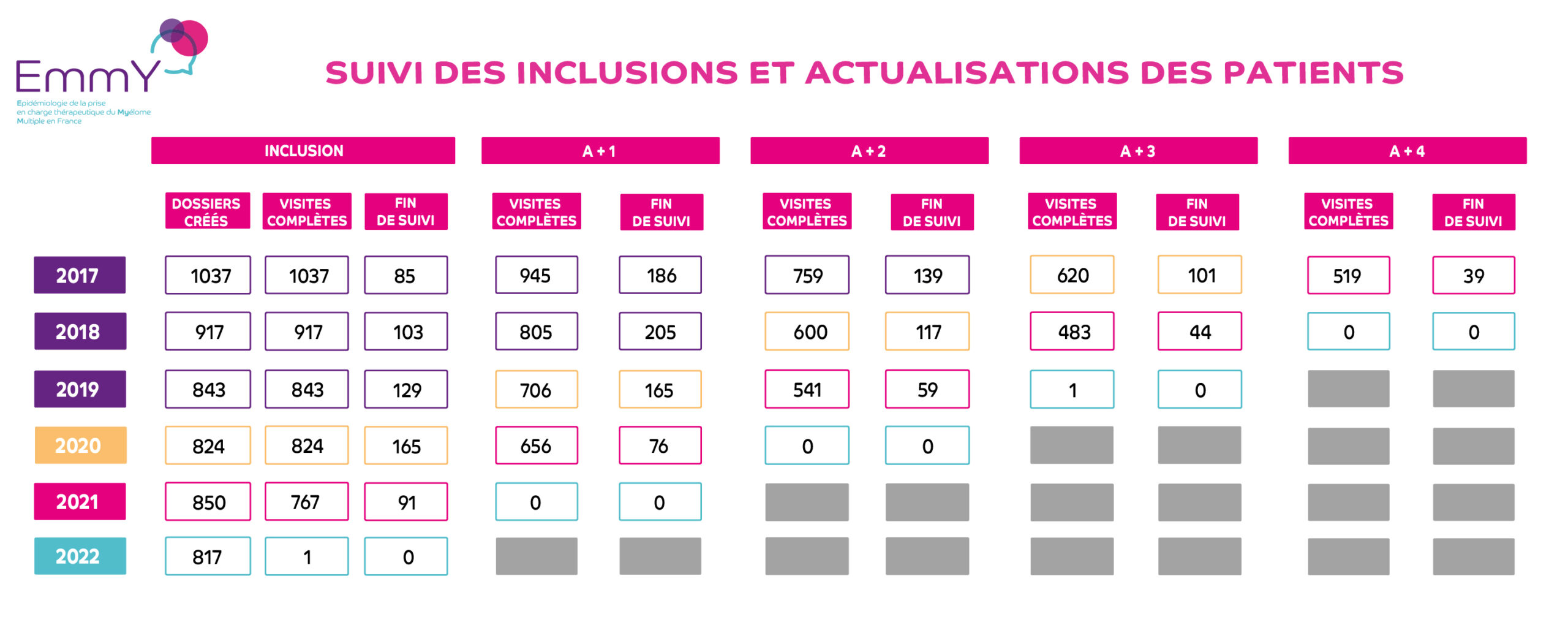 Aujourd’hui la cohorte EMMY représente plus de 7 037 personnes-années pour les 3 616 patients au recueil en Avril 2022, ce qui en fait l’une des cohortes européennes du myélome multiple la plus importante.